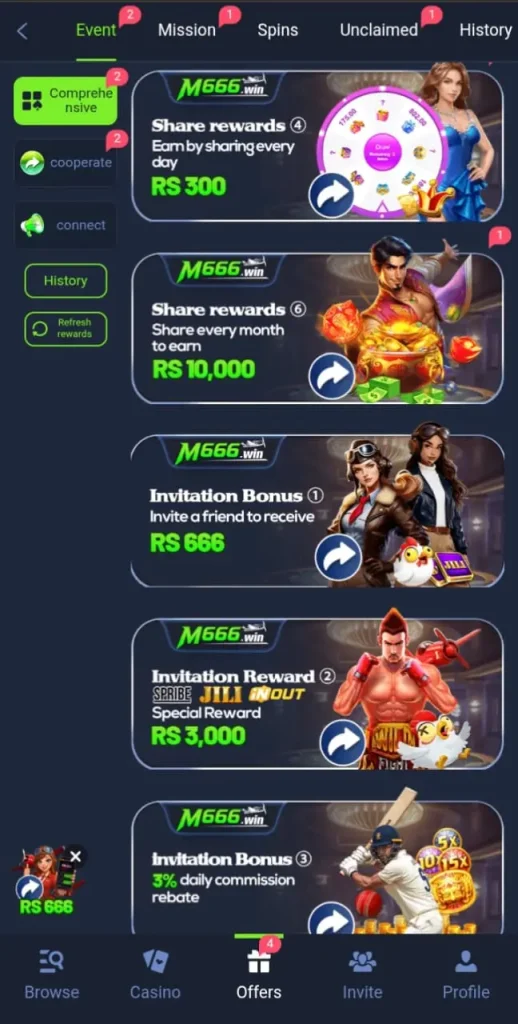 - M6666 has daily bonuses, referral rewards, and cashback, making it rewarding.